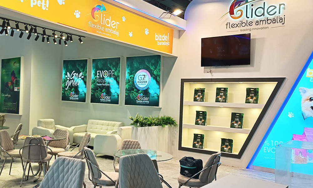 This design we made at the 2024 Izmir Türkiye fairground is a customizable disposable wooden custom-made exhibition stand. White and black chipboard were selected as the material for the stand construction and the signage selection was applied as hidden LED illuminated foam letter cutting.